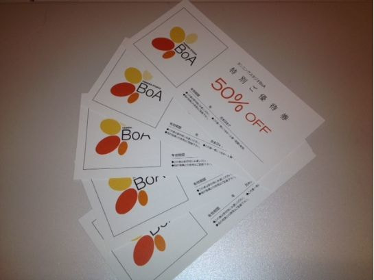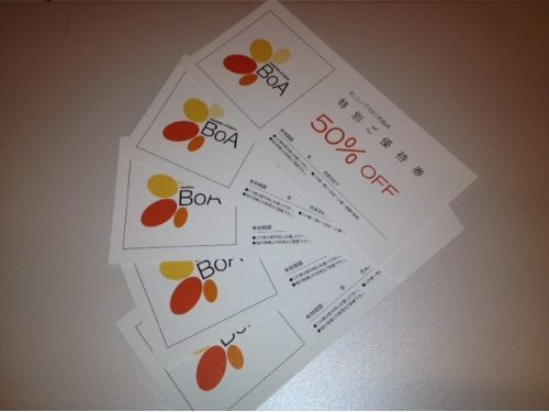 月4回以上 BoAのタンニングをご利用のお客様には、4回目のタンニング終了時に半額券をプレゼントさせていただきます♪