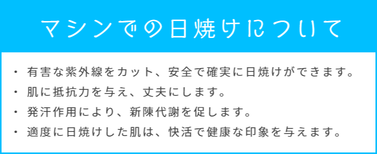ご自身の肌質、お好みの色で利用マシンや時間を設定できるので、真夏の太陽のように火傷する事がなく、安全に日焼けする事ができます。